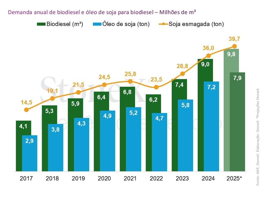 Segundo dados divulgados pela StoneX, a demanda nacional de biodiesel, antes estimada em 9,9 milhões de m³, foi ajustada para 9,8 milhões de m³ após a revisão da expectativa de crescimento do consumo de diesel B, que recuou de 3,0% para 2,7%.