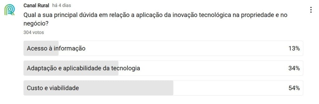 Na interatividade da semana perguntamos: Qual a sua principal dúvida em relação a aplicação da inovação tecnológica na propriedade e no negócio? O resultado mostrou o que mais preocupa os produtores rurais na hora de adotar inovações tecnológicas nas propriedades: 54% dos produtores apontaram o custo e a viabilidade como os principais entraves.