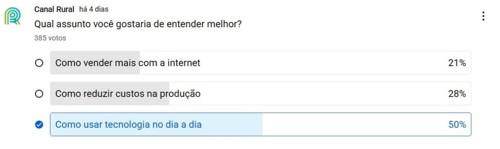 Na interatividade da semana, perguntamos aos produtores rurais: “Qual assunto você gostaria de entender melhor?” O resultado mostrou que a tecnologia é o tema que mais desperta interesse. 50% indicaram querer aprender a usar tecnologia no dia a dia. Para apoiar esse público, o Sebrae já mantém um portal exclusivo com conteúdos, cursos e ferramentas voltados para inovação no campo, reforçando o quanto o tema é prioritário para o agronegócio.