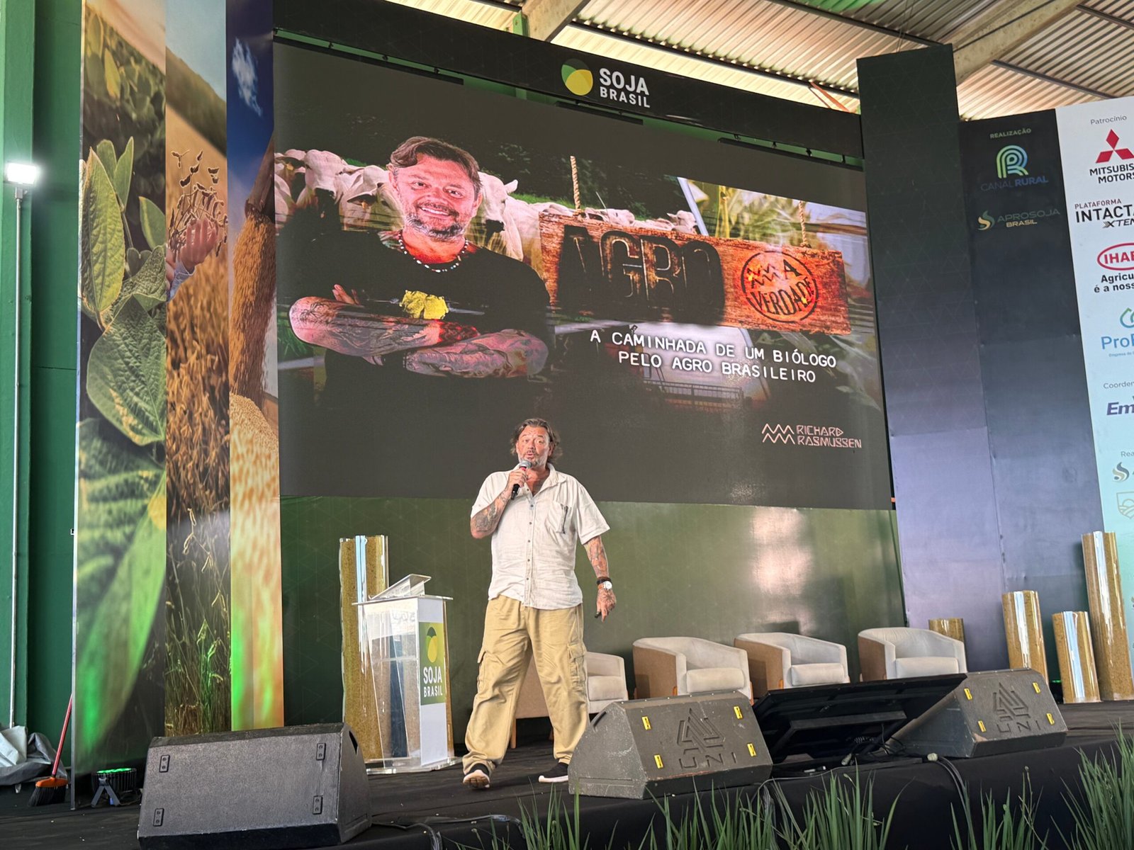 Ao provocar o público com a pergunta “Por que a gente produz tanta soja?”, o biólogo chamou atenção para o distanciamento da população das cidades em relação à origem dos alimentos e até das roupas consumidas no dia a dia. Segundo ele, a facilidade de acesso aos produtos tornou o processo produtivo invisível, o que gera interpretações equivocadas sobre o papel do agronegócio.